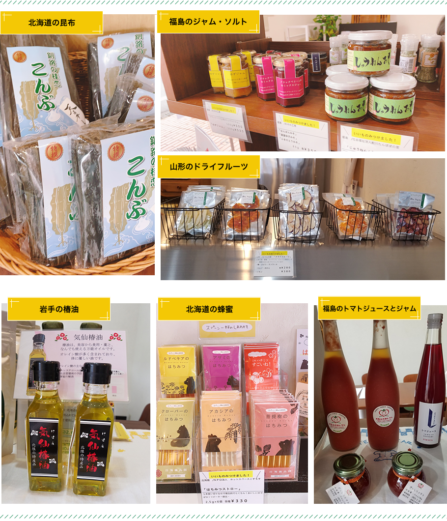 メルヴェイユ仙台店舗の一角に「セレクトショップ」をオープン! 材料や製造工程にこだわり「安全」「安心」「美味しさ」を追及しているところは、当事業所と共通するところです。 北海道、岩手、山形、福島県の福祉事業所から選び抜かれた商品を揃えています。 遠くまで行かなくても当店で…、カガログではなく、実際手に取ってご覧いただける…等、生産者と消費者を繋ぐ役割を狙っています。ぜひ、ご来店ください。